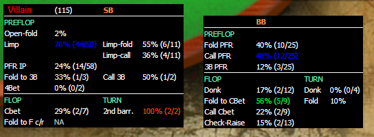 Очень странный HUD... Действительно почему так расписанны сэмплы? Тотал хэндс 115 - ок. На BB почему-то всего 25 рук. А с SB вообще путаница. Обычно в знаменателе префлоп действий пишут общее число рук, сыгранных на данном позиции. Тут это 58 и вроде бы адекватно ПФР и лимп расписанны, но откуда взялся лимп???!!! bomba-tiktak, ты не прав - 115 рук это всего (SB+BB) (кстати возможно тут кривой хад и он учитывает руки не из hu, т.е. 115-58-25 = 32 руки были сыгранны в другой дисциплине), а на SB опен фолд должен быть 0%