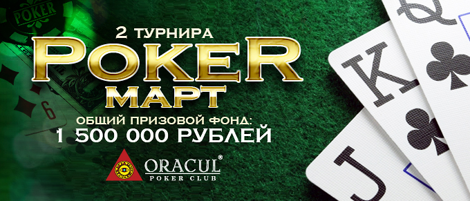 В покерном клубе «Оракул» в марте месяце пройдут 2 турнира с общим гарантированным призовым фондом 1.500.000 рублей.