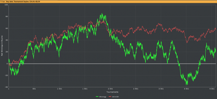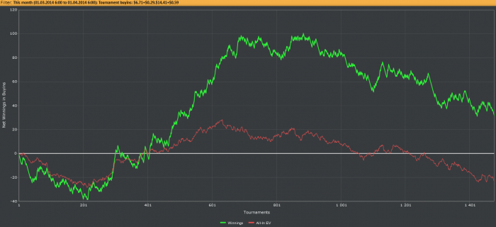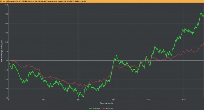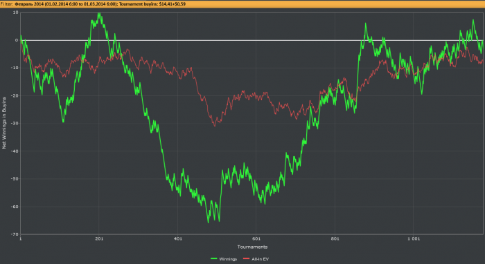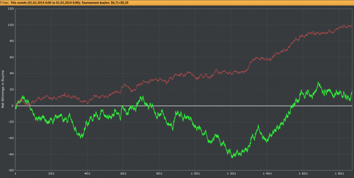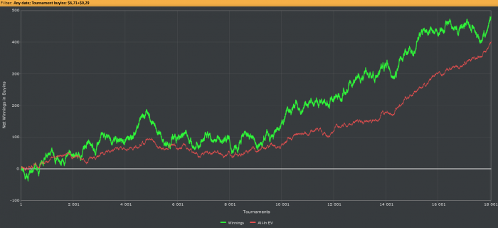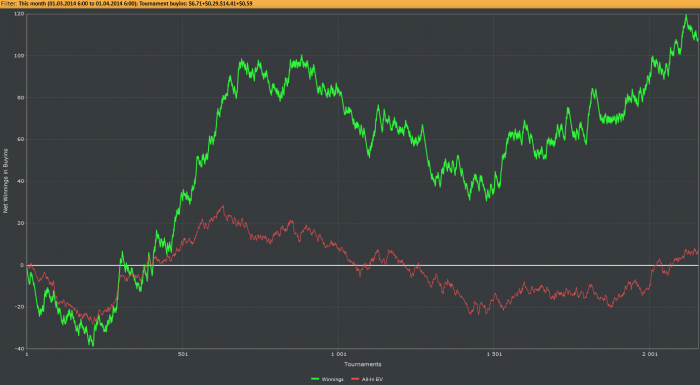 Всем привет! Меня зовут Николай, я из Москвы. Познакомился с покером в 2008, когда был халявный Онгейм, куча рыбы и куча бесплатных водов) В это время покер был способом заработать мелкий прайс на пивко и т.п.) Сначала играл как и все тогда 9макс турбо, на 15$ словил серьезный даунстрик (скорее всего просто слабо играл))) и переместился на ФТП. Там пришлось постепенно осваивать постфлоп, неплохо получалось играть 90макс снг, потом засел в гипертурбо, так я стал плотно играть гипертурбо 6макс. Поднялся с 3.5$ до 15$ лимита. Высоко забраться не получилось, так как постоянно делал мелкие кэшауты и время занимал институт, репетиции и концерты (я на гитаре еще играю). В 2011 я получил диплом, самое время заняться плотно покером, но внезапно накрылся ФТП вместе с моим банкроллом... Так я решился пойти работать инженером)))) В покер это время не играл совсем. Меня хватило на два года, что-то нравилось, что-то нет, но потом пришло осознание что в России (по крайней мере) быть инженером совсем не то, о чем я мечтал в детстве) В итоге я уволился, и начал снова катать, но уже на Старзах) быстро прошел 3.5$ лимит, на 7$ пришлось задержаться, потому что поле стало намного сильней, чем два-три года назад. Сейчас миксую 7$ и 15$ лимит, вот графики по лимитам почти за 6 месяцев: