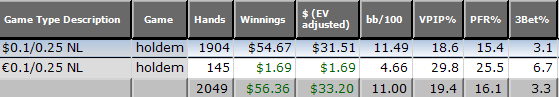MP: $27.84 - VPIP: 23, PFR: 17, 3B: 7, AF: 2.2, Hands: 57799