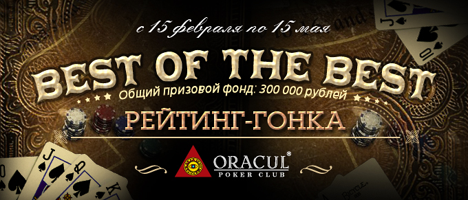 В покерном клубе "ORACUL" с 15 февраля по 15 мая проходит рейтинг-гонка BEST OF THE BEST за общий призовой фонд 300 000 рублей.