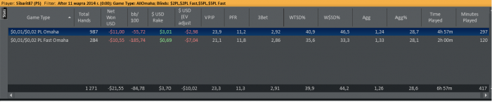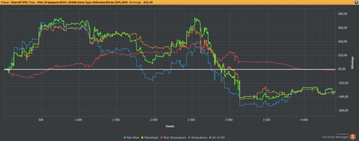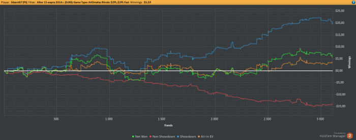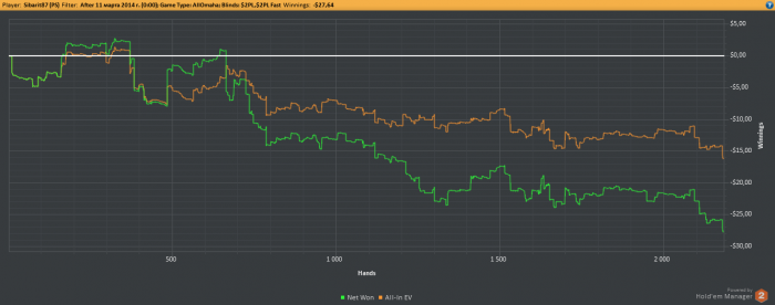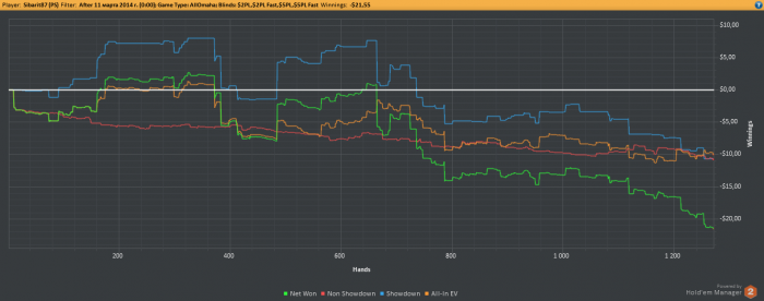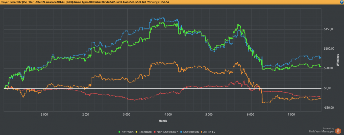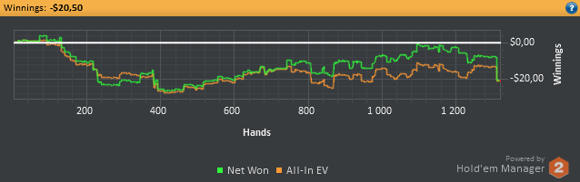 Как уже было сказано, на волне апстрика поднял немножко бабосиков (с 15 до 250 долларов буквально за 3-4 дня) поиграв в ПЛО отПЛ5 до ПЛ25, но апстрик закончился, но успев во-время остановиться я сохранил часть денег. И решил, а почему бы не попробовать поиграть серьезно. Поставил триал ХолдемМенеджера, и отыграл за пару недель наверное большее количество рук, чем за все предыдущие годы. И опять же не проиграл (конечно не без помощи апстрика). Дистанция конечно не большая около 7К рук, но для меня существенная, но меня пока вдохновляет. Удалось почти восстановить утраченное, но пара неудачных сессий, в котрые немножко тильтанул, и я опять откатился вниз.