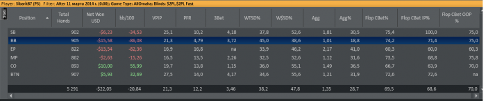 2) Позиционная игра - твой впип должен динамически рости от ЕП к БТН , причем на ЕП он должен быть настолько минимален , насколько это возможно , у меня это 17%( дальше я буду подставлять свои числа) , МП = 21% ,СО = 36% ,БТН = 50% ,СБ = 25%(у меня такой большой впип на сб обусловлен моей стратегией игры , которая подразумевает стил с сб = 50% - это много, без подготовки это не просто организовать), ББ = 31.