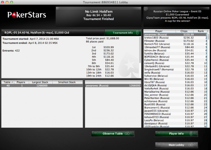 Например, если игрок, зарегистрированный на PokerStars от GipsyTeam, занял первое место в общем зачете по итогам серии, его приз составит $700 по общему зачету + $700 по зачету среди игроков GipsyTeam. Для получения своего приза всем игрокам GipsyTeam нужно будет связаться с нашей службой поддержки