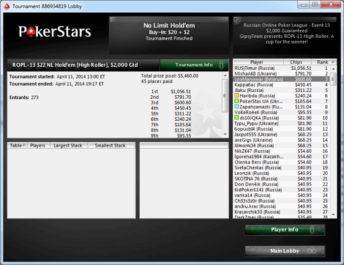 Например, если игрок, зарегистрированный на PokerStars от GipsyTeam, занял первое место в общем зачете по итогам серии, его приз составит $700 по общему зачету + $700 по зачету среди игроков GipsyTeam. Для получения своего приза всем игрокам GipsyTeam нужно будет связаться с нашей службой поддержки