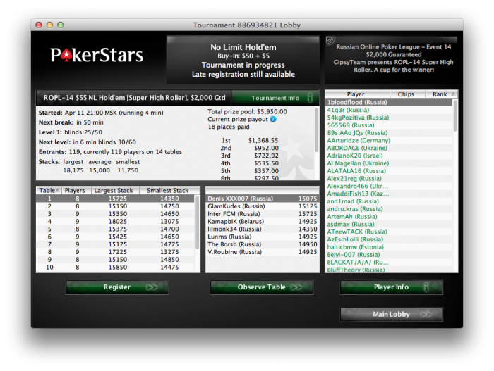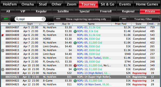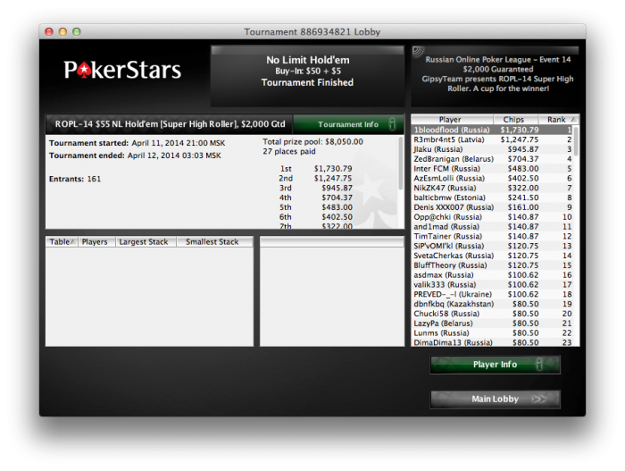 ROPL-13 $22 High Roller, гарантия $2,000 PokerStars, 11 апреля 21:00 МСК (поздняя регистрация 60 минут) ID 886934819, пароль Johnston Обсуждение на форуме