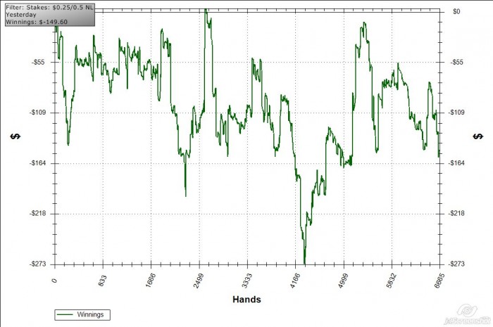 Примерно на 1к рук))) меня деморализовала вот эта раздача.