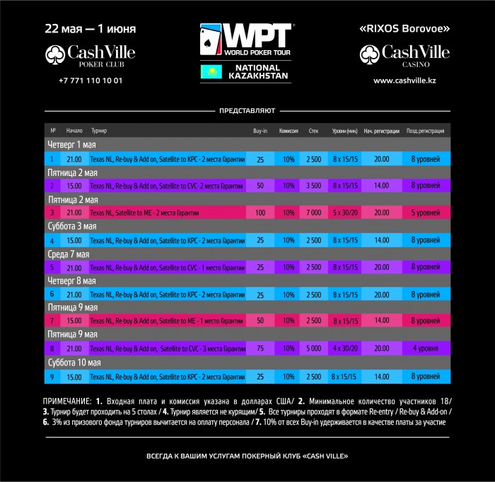 PartyPoker WPT National 500 Kazakhstan Poker Championship $100k GTD($500 + $50)22-25 мая WPTN Classic 6 Shooter (6 Handed) $25k GTD($500)25 мая Cash Ville Cup $100k GTD($800)26 – 29 мая PartyPoker WPT National & EAPT 1500 $250k GTD($1500 + $150) 29 мая– 1 июня WPTN Turbo Charged Deep Stack $20k GTD($500) 30 мая WPTN Wanted Bounty $15k GTD($300 + $30) 31 мая
