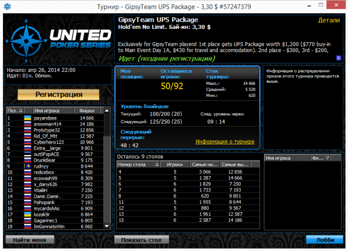 Дата: 26 апреля (суббота), 21:00 МСК Бай-ин: $3.30 Формат: 6-макс фризаут, стартовый стек 3,000, уровни по 12 минут Обязательное условие для участия: регистрация на LotosPoker от GipsyTeam
