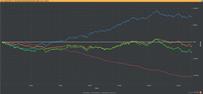 Что касается статов то стараюсь играть в стиле ТАГа (20/17 3бет 7), но по факту на дистанции в 130к рук у меня 18/16 3бет 5,7