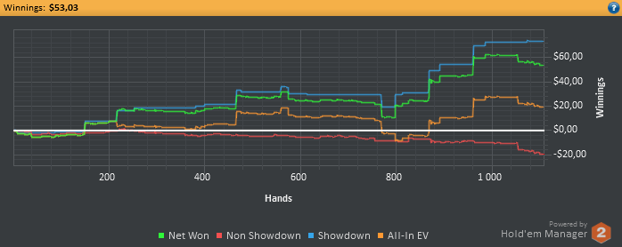 Продолжаю показывать хорошую игру. Немного перебираю по ЕВ, но я даже не уверен что перебираю. Столько лет играю в покер, а до сих пор до конца не понимаю как HM2 считает ЕВ )))) Просто доски складываются в мою сторону, и пусть так и будет. Недобор в 25би надо же как-то возвращать :D