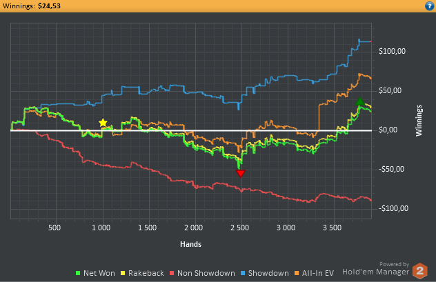 А, ну да. Забыл описать, как дела в покере: был побит нл10сх с вр около 10/100, дрочил нл25 в ноль, потом началась вся эта хуйня с универом, проблемы с машиной, девушкой, ну и пиздец покеру пришел. Выебали меня за последний месяц, как Сашу Грей за всю жизнь не ебали. Сам виноват, конечно, что в таком состоянии садился, что даже B-игру показать не мог. Принято решение спуститься обратно на нл10.