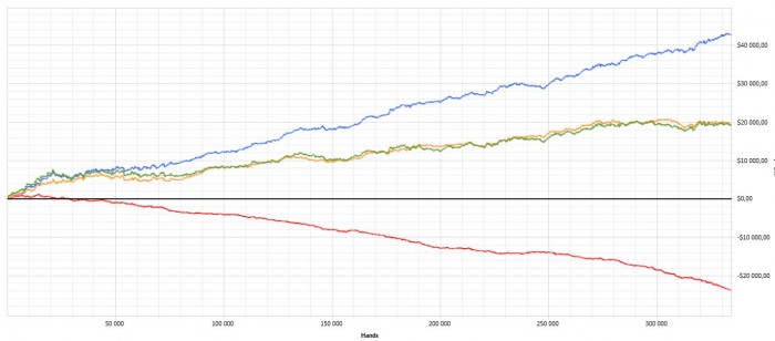 Как и обещал, выкладываю график после занятий с ТС. График с нл25 сх зум за июль. По ев 12.45bb/100. Дистанция конечно небольшая, но и на одном только апе так не сыграть. До этого, напомню, играл около нуля или в слабый плюс на нл25. Теперь скорее всего смогу побить и нл50 (обычные столы уж точно), но пока перестраховываюсь. В общем моё мнение не изменилось, по-прежнему рекомендую этого тренера.