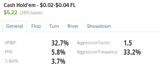 Итог за первую неделю на старзах: 3000 рук на FL 0,2-0,4$, +5,2$, в банке 35,2$. Зарегался в ПокерСтартере, взялся за теорию, мониторю статистику в худе. Показатели VPIP, PFR и AF далеки от оптимальных, буду исправлять.