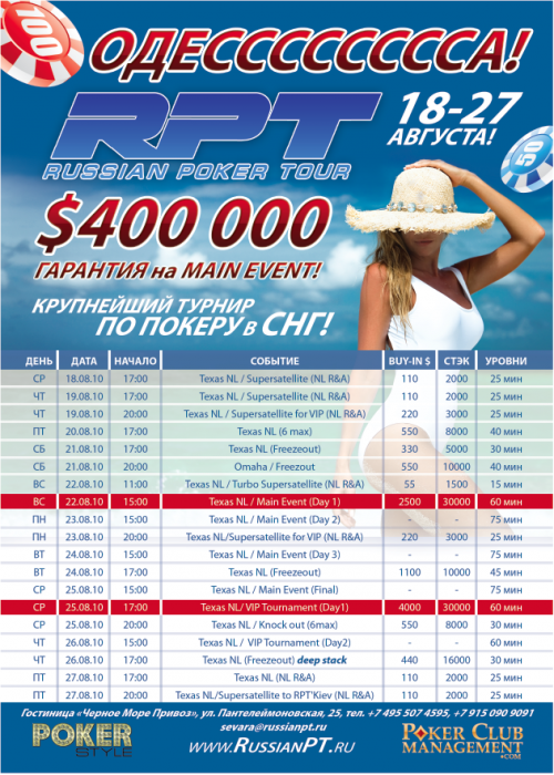 Особенности: RPT Одесса - это отличная возможность совместить прекрасный отдых, и крупнейшие турниры в СНГ. Если кто не был в Одессе, знайте, что эта южная столица Украины. Летом там кипит жизнь, народ приезжает со всего СНГ. Много местных игроков, в том числе катающих дорогой кэш.