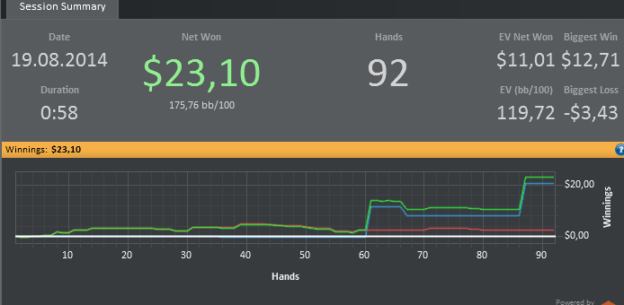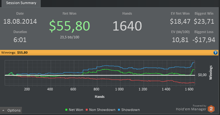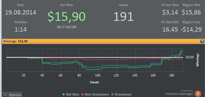 Все идет не так быстро как хотелось бы. Попадал 2 раза в даунсрик. Один на 130 долларов, другой на 200. Но это не убило мой банкролл, а значит продолжаем марафон. Сдаваться никто не собирается. На данный момент все деньги в Winner poker. Сумма 312 фунтов, что ровняется 508 $ и еще бонусные деньги 100 $ буквально через несколько раздач. В турнирах пока резульатов не добился, так как играл их мало. Было близко от финалок, но в конце немного не везло. За это время разобрался со своим попапом в hm2. Убрал лишние показатели. Хочу в ближайшие дни разобраться в тэйбл ниндня, чтобы упростить игру и возможно добавить количество столов, так как больше шести столов играть не могу. Играю сейчас нл20.