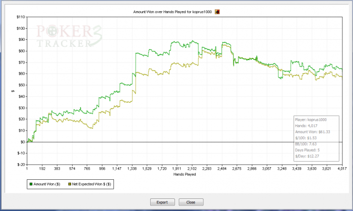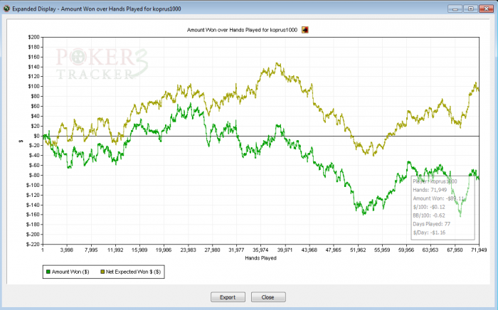 Но в июне 2009 года,нагулявшись,решил стать покерным задротом. Уверенно прошел НЛ5 и.... уверенно,уже год,стою на месте на НЛ10 Причина моего долгого обитания на этом злосчастном лимите- отсутствие дисциплины(много денег инвестирую в турниры,постоянно меняю покерные дисциплины) и лень к самообразованию("Да нафига мне это смотреть/читать,там все то,что я и так знаю,меня просто постоянно переезжают и кулеры сдают").