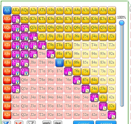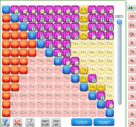 Ещё я бы ставил не очень много 3их пар в районе 30% а это ( 75s, 65s, 54s,53s ) мы будем часто по такой структуре их бетить и дальше + их можно добавлять очень хорошо в трипл баррель,так как они блочат опу всякие гатшоты,оесд и их можно легко превращать в блеф на ривере( Хотя тоже зависит от структуры доски )