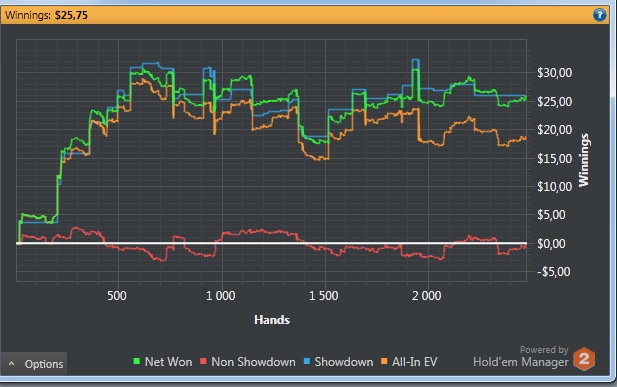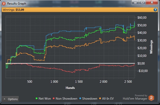 Выходной прошёл более менее, сначала за 1к рук +5БИ, причём доходит что такое динамика, которой нет в зуме и что-такое взбесить оппа, сначала у одного вскрыл блеф на стек, не удачно он сделал это в мой сет, а потом через 2 раздачи он же мне попадается, и пушит в моих КК свои Q9s, на борд выпало ему флеш дро и топ пара, и я уже думал, "ну вот началось"....но без чудес))