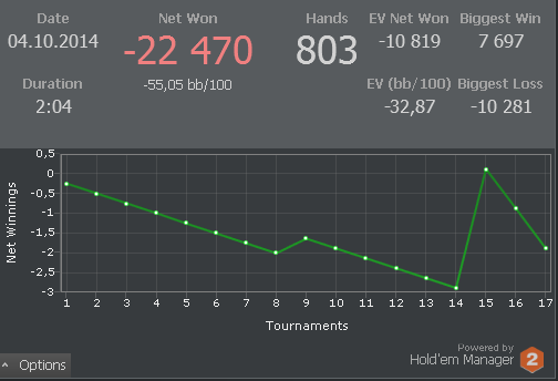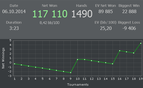 Как и предполагалось, сегодня не играл - сделал себе выходной. Завтра собираюсь сыграть добротную сессию( 30-40 турниров) и выложить полный обзор со скринами и прочей фигней. Банкролл на данный момент - 14.52.