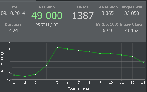 Добротной сессии не получилось - сплошное невезение. Отыграл 15 турниров, из них 1 ИТМ - 6-е место. Примерно на середине сессии рискнул открыть спин-н-гоу - выиграл турнир на $4, два следующих проиграл и остановился. Итог - в кассе 12.39 (-2.13).