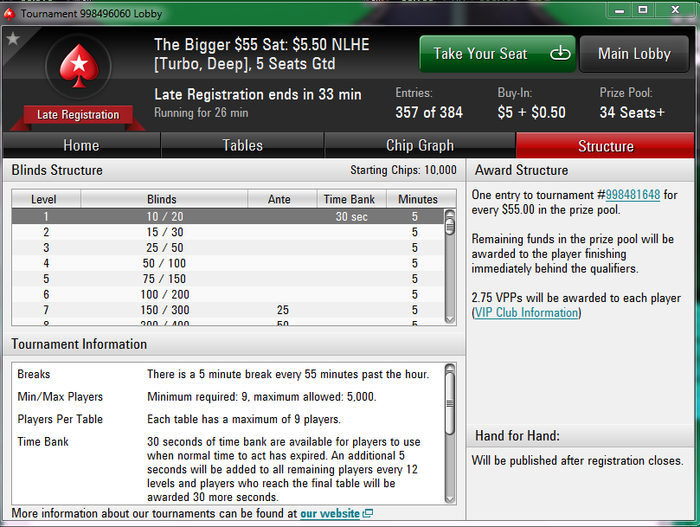 сегодня нарвался на такой сателлит The Bigger $55 sat: $5.5 NLHE turbo deep (10.000 chips)