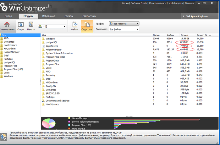Установил Ashampoo WinOptimizer 11, для того чтобы глянуть куда ушло свободное место.