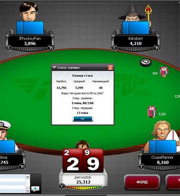 Перешел на ФТП - 4 стола - о нет - ничего не видать - 3 - фигня, - только 2 стола.. лейауты кошмарные в таких маленьких окнах - решил сосредоточится на одном окне - выбрал турнир - дейли доллар в раш мтт. Интересная раздача- я на ББ примерно после часа игры - чек, затем следует пуш олл -ин больше моего стека на каких то дровах, я естественно собираюсь нажать на фолд - но мой тачпад другого мнения об опооненте - вроде аккуратно пытался сдвинуть курсор - но все таки тачпад выбрал кол, конечно аут, ребай, и сново в бой.После второго перерыва - 55 место из оставшихся 2500 игроков, затем вляпался с JJ во флеш, скоротал время летая между столами и с 4к -> 17к фишек и подарил их на памяь АК на борде ААК92 с моими А9 :) Ну, вроде дело сделал 950й - можно и спать..