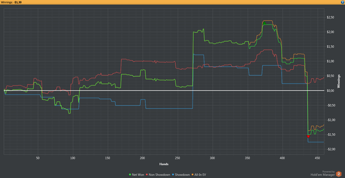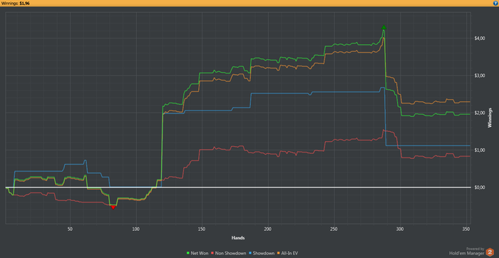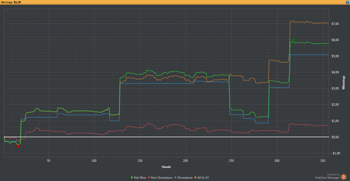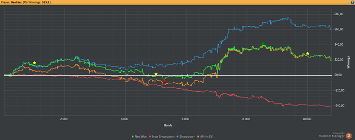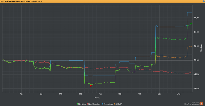 Хех. Сначала замазался, попав на стек со своим фул-хаусом против каре, но потом отмазался, в процессе активно пытаясь намайнить сет (безуспешно чаще всего) и получив свое каре тоже. Слишком много каре в последнее время встречается. Еще странность: чувак выставился с туз-валет одномастные против моих КК, я затащил. но ХМ написал, что это -ев., и потому у меня на графике ев-линия существенно ниже зеленой. СТранно. Никто не знает, почему он так посчитал?