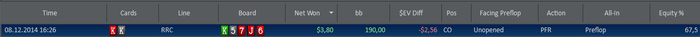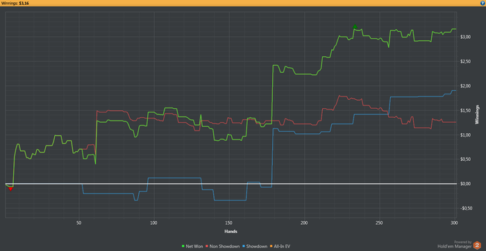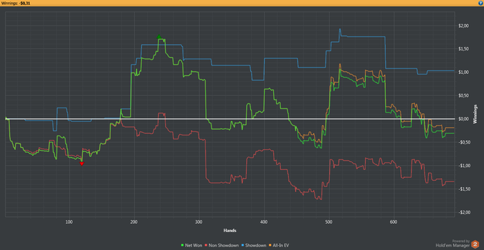 Vladpoff, получается, что показатель EV$Diff в ХМ2 показывает, сколько надо из Net Won вычесть, чтобы получить выигрышь по ев? ВРоде логично, но мой внутренний жлоб говорит, что слишком мало по ЕВ. В самой раздаче выставились на префлопе, ничего интересного. Вот информация с ХМ:
