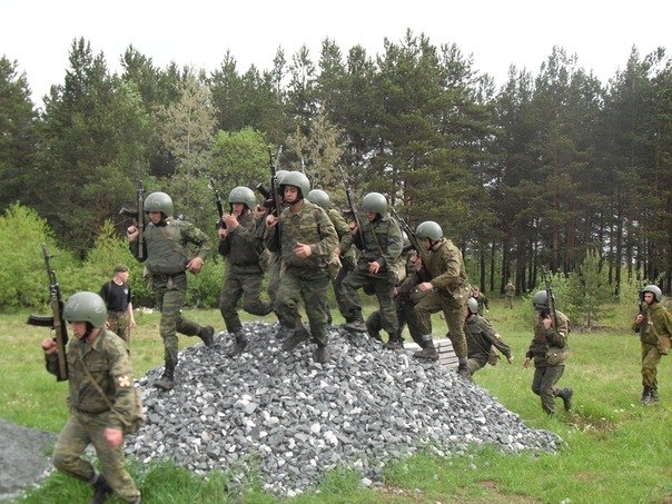 Вот выпили мы чайку, заходим как ни в чём не бывало в роту, и дневальный с поста сразу орёт "Рота, тревога! По полной боевой на взлётке становись" Конечно же что такое полная боевая мы знать не знаем, как одевается броня и какой автомат брать тоже не понимаем, деды орут, повторяйте за нами, и мы носимся за дедушками в первую комнату "СибСАО" (комната средств индивидуальной бронезащиты и еще чего то там) Хватаем броню (бронежилет "Штурм ВВ" 5го класса защиты - 20кг, Шлем "Скат" - 3 кг, противогазы, общевойсковой защитный костюм) Залетаем в Комнату для Хранения Оружия берём стволы, магазины, - 5кг) И во всём этом строимся на взлётке твой вес + 20-25кг еще давит на тебя (еще треть меня на мои плечи повесили) Буш даёт команду строится на платцу, мы выбигаем из роты и строимся (моё очко в это время сжалось, до наномиллиметров, я думаю туда игорочку просунуть не получилось бы, я мысленно попрощался с жизнью, исповедовался перед Богом, попросил отпушения всех грехов, и мысленно отпустил их себе)))
