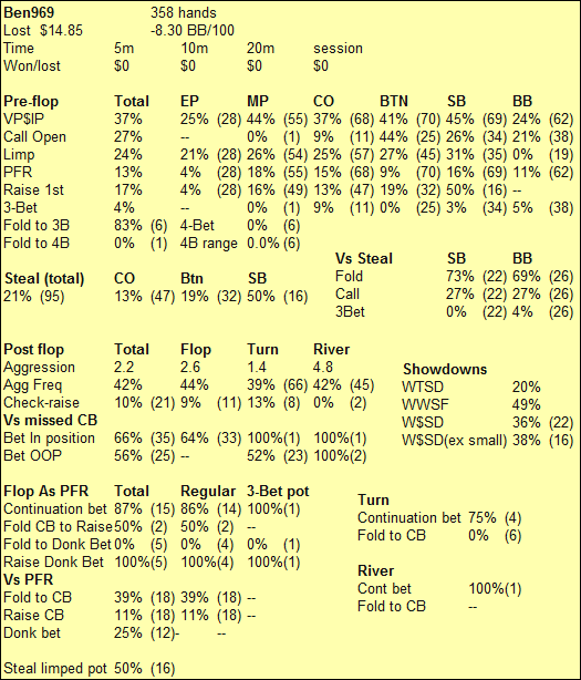У оппонента 4% PFR c ранней позиции; WTSD 20%, WWSF 49 %, вскрывает сильные руки только; на терне и ривере много страшных для нас карт, которые усилят его возможные AK, AQ. Я за рейз флопа 12-13 $ хотим выбить AK, AQ и у пасть на пуш от QQ+.