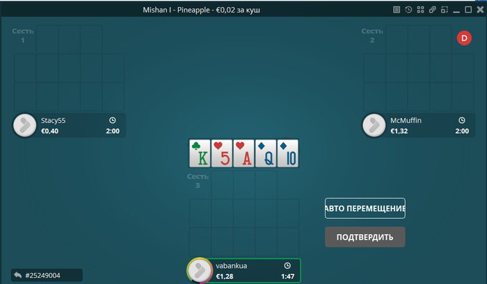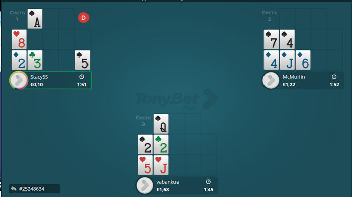 Слишком оптимистично. Понятно, что ты хочешь собрать два флеша. И иногда это будет получаться. А в остальных случаях такая раскладка (дама вниз) имеет мало смысла. Ситуация усугубляется тем, что мы без позы, и играем вслепую.