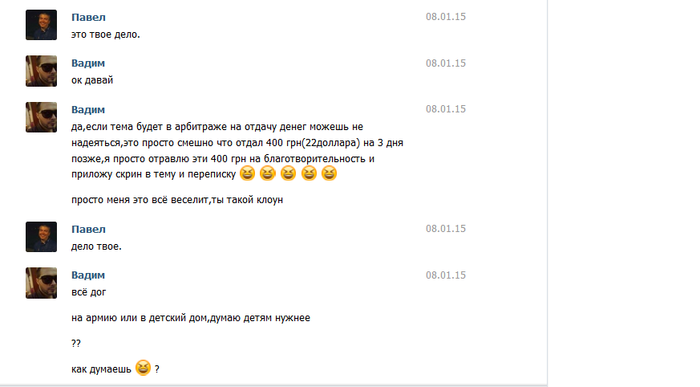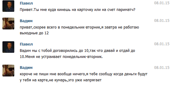 Ждать мне неудобно так как я живу в Донецке и ближайший банкомат находится в 120 км в Селидово,я как раз планировал поехать к родителям на выходные(10,11) которые живут недалеко от Селидово.Ехать специально что бы снять 400гр через 5 блокпостов не очень хочется(это если Вадим бы отдал деньги). Вадим не просит у меня отсрочки,а просто ставит в известность что отдаст когда ему будет удобно и то "скорее всего"(а может и не отдаст). Так же пару лет назад я занял Вадиму 1300 тоже на ставки,которые он мне отдавал вместо обговоренного месяца,3 или 4 месяца с формулировкой у него есть более важные долги чем мой,так как я все равно все проиграю.