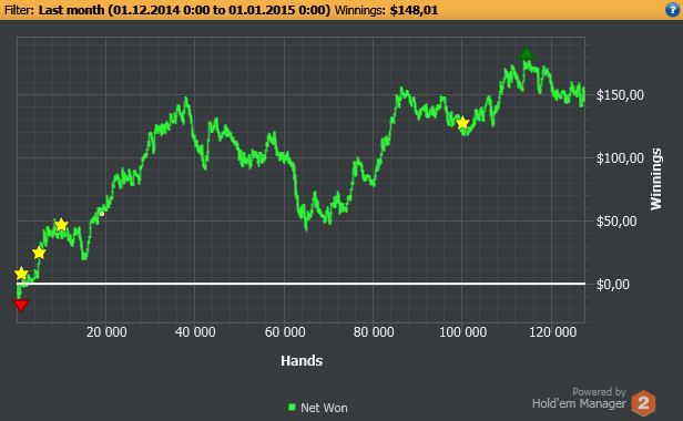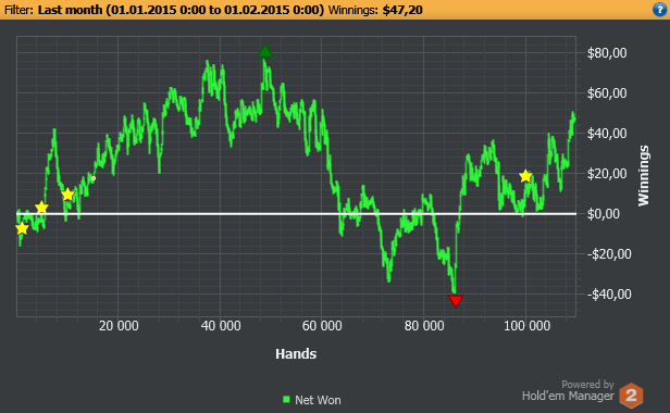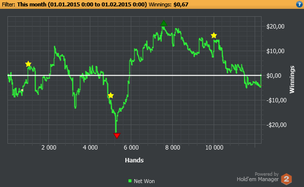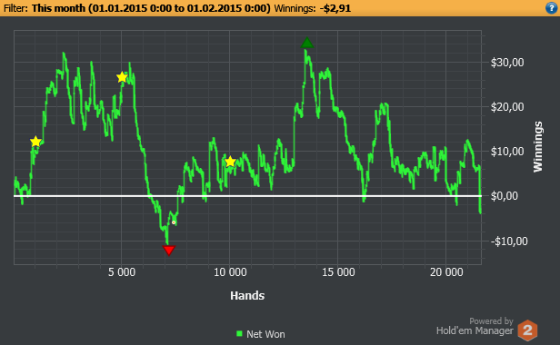 Январь проходит в жалких попытках собраться с мыслями и начать работать, но, в основном, весёлые компании и алкоголь были сильнее меня. Начинаю серьёзно работать с 12 января и в планах наиграть около 150к рук.