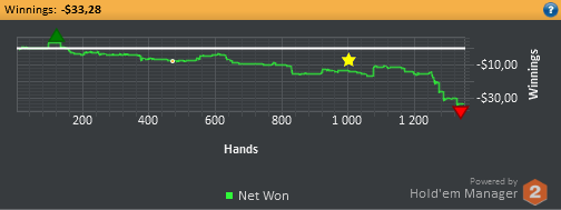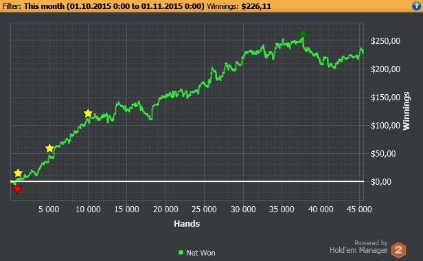 При этом, не забывайте, что я много работаю вне столов! Уйму времени мне пришлось провести в ХМе: разбирать трудные споты, находить упущенные +ЕВ ситуации, вычислять лики своих оппонентов, учиться чему-то новому у топ-регов лимита (нл5!) и, конечно же, просто любоваться своим графиком.