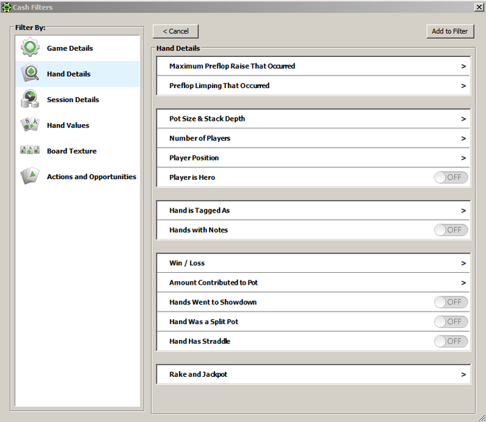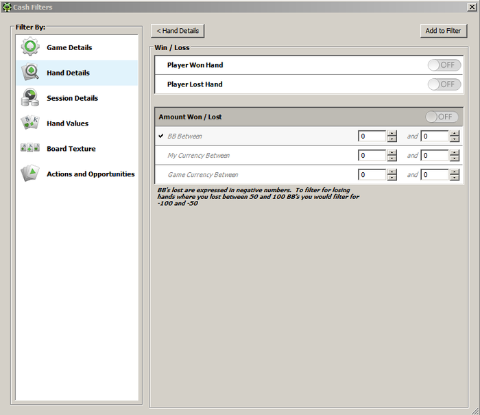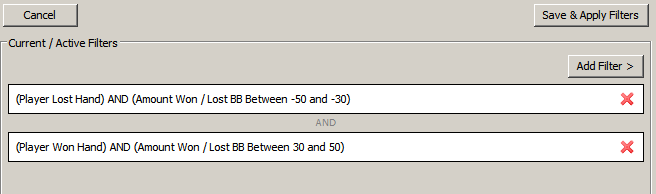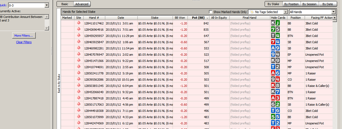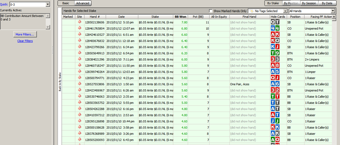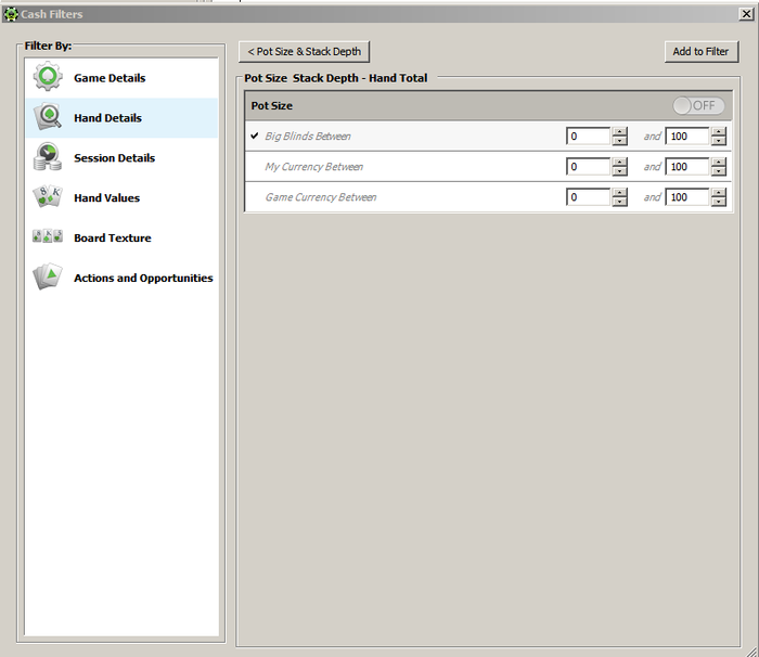 Пробовал тут, но ПТ4 учитывает все банки, и нашу прибыль/убыток в них. Те если мы установили фильтр - Поты от 50 до 100бб, при этом на префлопе с СБ скинули Д2о, потеряв 0,5ББ, а при дальнейшем розыгрыше пот был раздут до 100бб, то он запишет убыток 0,5бб... То же самое, если бы мы были ПФР в мультипоте и поставили конбет, но затем скинули на экшн, он запишет нам в убыток сумму потеряных фишек, хотя эта рука никаким боком к размеру пота не относится...
