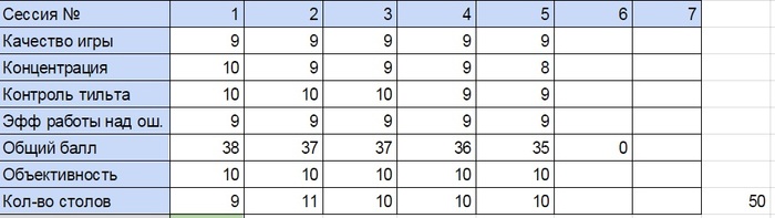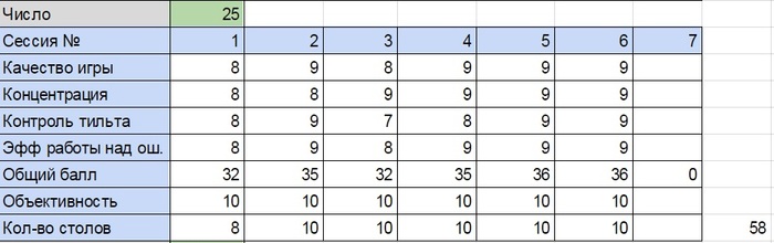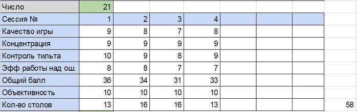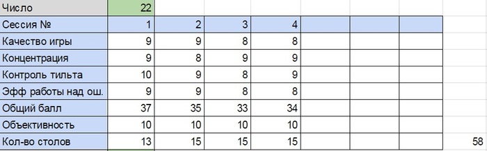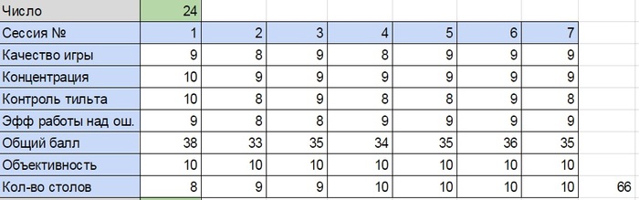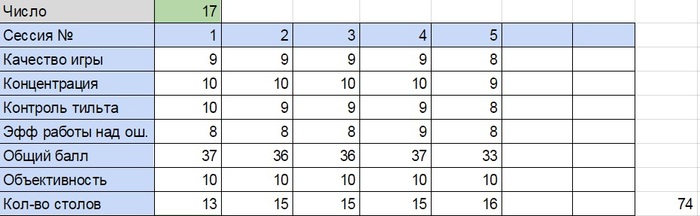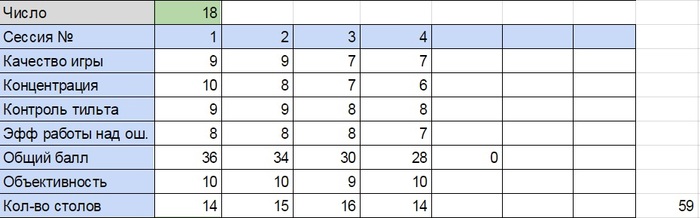 Сегодня сыграл 74 тура, вот дополненный график, битва со стриком продолжается) Играю сессиями по 13-16 столов, после каждой из них свою игру оцениваю по 4-м параметрам - качество игры концентрация, контроль тильта, эфф работы над ошибками. Сумма помогает мне узнать какая игра у меня преобладает - А, B, С. В таблице это выглядит примерно так - результаты за сегодня: Объективность нужна чтобы на следующий день переоценить, оценки выставленные в предыдущий день. Данная простая система позволяет следить за качеством своей игры, а не поддаваться реакциям на временные результаты, как хорошие, так и плохие.