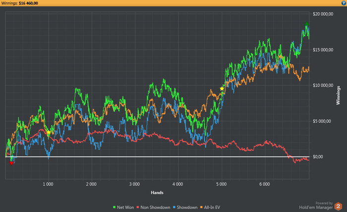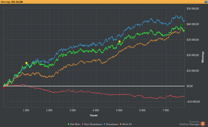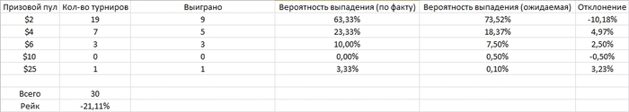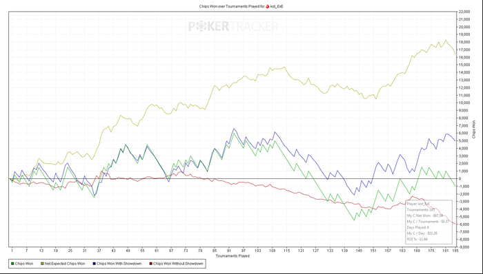Как известно на пс проходят сателлиты на SM, HT 36max, 2-x shootout, 6max за 7 баксов. Проходишь первый стол, вернул байин, выигрываешь второй, получаешь 215$. Результаты таких регов как kawachi1984, oliolion, DarkAvenger3, daraduda1 меня впечатляли и впечатляют до сих пор. Насмотря на офигенный график по чипам в этих турнирах у меня попросту не хватало денег выдержать все круги ада дисперсии. В итоге я вынужден отказаться от этой замечательной на мой взгляд дисциплины, в которой куча фишей, которые хотят попасть в СМ, в которой все регги известны и ты знаешь их стратегию и стиль игры, где ты можешь играть быстро и зарабатывать много. Но увы. Я намерено рассказываю о своём опыте, надеюсь кто-нибудь заценит эту дисциплину, и скажет мне потом спасибо. Повторюсь, я не хотел о ней писать, в надежде, что я вернусь в неё сам и совладаю с дисперсией, но трёх пинков под жопу достаточно.