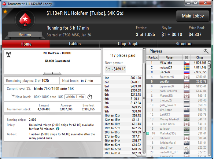 Самое лучшее что было к концу сессии это 10 и 11 места в турнирах CAP 250 и CAP500 за 1$ и за 0,5$ соответственно. В итоге получилось отыграть в 0. Хотел уже закрывать клиент, как увидел сладкий турнир за 0.82$, начинавшийся в 1:15 . В этих турнирах просто отличнейшая структура и попасть в ITM очень легко.