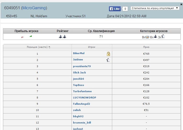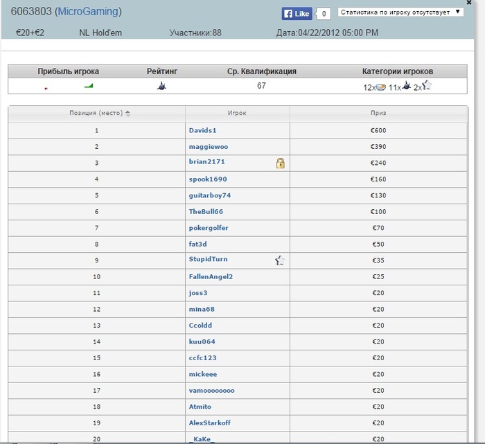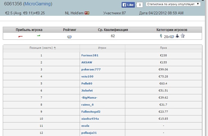 Сразу занял второе место в турнире на 130 человек за 5 евро Помню, что играл я тогда очень тайтово, почти не исполнял, а с хорошими картами (очень узкий диапазон) либо пихал олын, либо просто большие рейзы делал (на ранней стадии). Играл я тогда совсем мало турниров, 2-3 в день Полная пачка заносов в порядке хронологии: