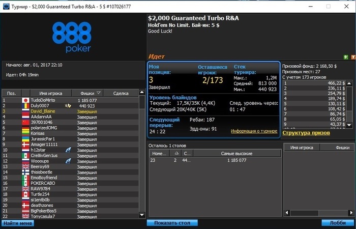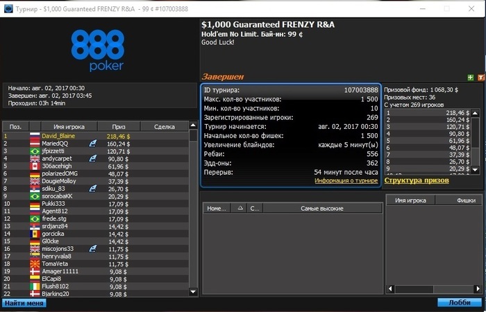 888: +1124 $ (1985 турниров)