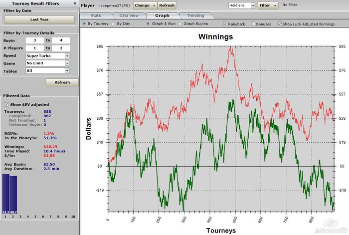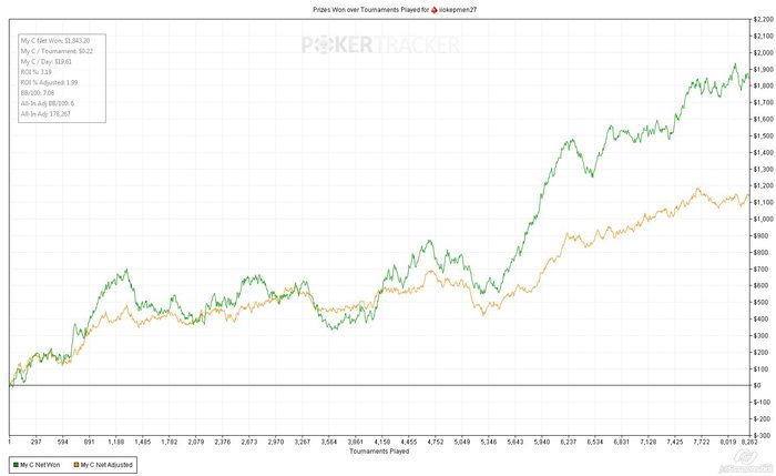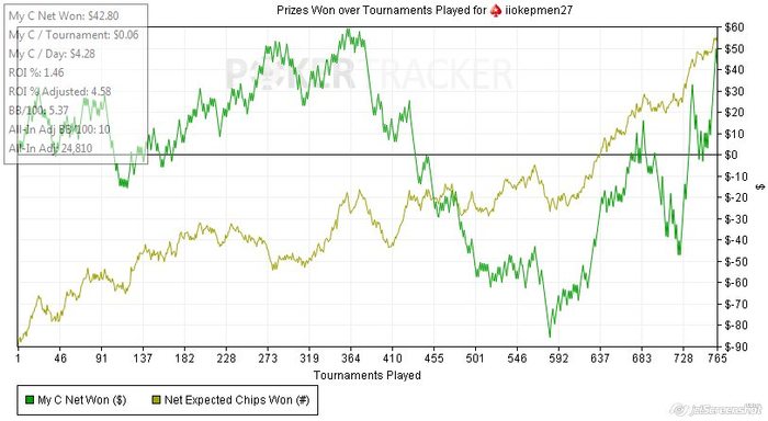 Игру надо было ждать + 1к турниров в ноль при том что игру приходилось ждать, и даже 50 турниров в день было играть очень сложно я решил пойти в гиперы + набить голд стар За декабрь я добил все же голду, хоть и играл немного За этот год график выглядит получше, но EV не дает мне покоя Целью создания дневника является мотивация играть больше и качественнее. Я надеюсь что мысль о том, что хоть кто-то заглянет сюда и увидит, что я не откатал должное количество турниров в день или за месяц, и скажет:"Ну и трепло", заставит меня бороться с ленью (и дотой ) Собственно цели на месяц февраль: 1. Играть 200-300 туриков в день 2. Отыграть не менее 5к турниров за месяц 3. Переход на 7ки при 100 БИ (осталось примерно 40 наиграть для 7-к) 4. Брать не больше 5 выходных за месяц 5. Писать каждый день сюда отчет за день + пару интересных раздач 6. Самая главная цель это найти думающих адекватных регов 15+ , чтобы развиваться как игрок 7. Приобрести PT4 и Flopzilla