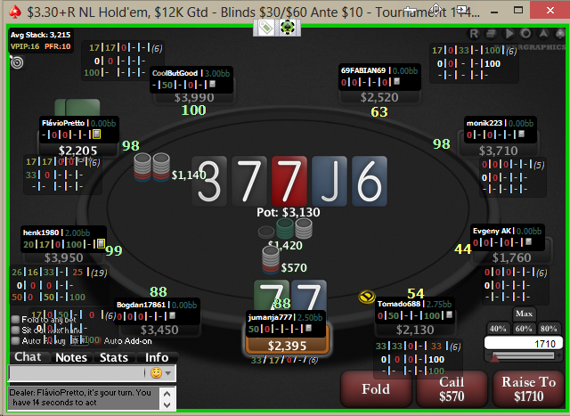 Вчера вечером играл 2ой день двухдневного тура за 11$ на ПС, в который прошел с субботнего пакета. В ИТМ складывалось довольно неплохо, наживал по тихой пока народ сидел педалировал. Но тут произошло вот это: Я реально призадумался тут о фолде