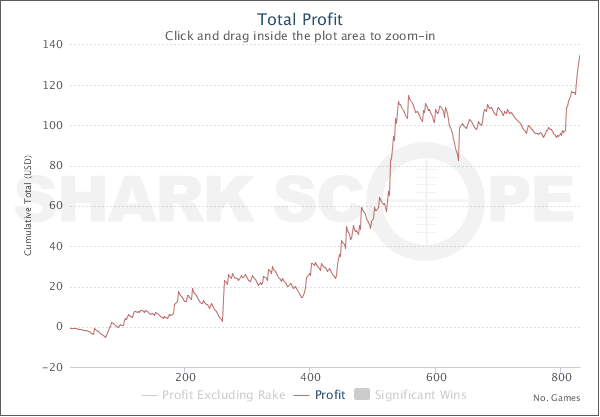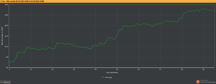 В покер играю 2 месяца. Начинал в январе играть СНГ 45мах за $0,5, потом перешёл на $1. Сильно апало, к концу января был пик по прибыли в $140.