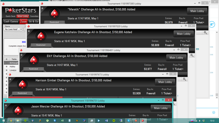 Решил немного поиграть в ZOOM, выирал билеты на челенджи от Старзов. Чтобы сгладить дисперсию, решили с коллегами обменяться "долями". Смысл такой: 1. Участвуем в 5 турнирах All-in shootout с номерами, приведёнными на скрине