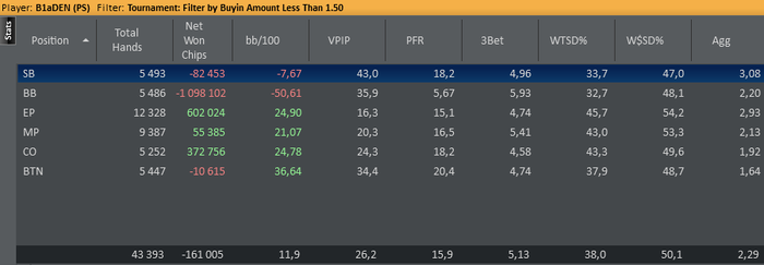 На Сб у тебя бешеный впип и мизерный для такого диапазона 3бет, это очень плохо, так как без агресси и без позы на постфлопе ты просто даришь деньги. На Сб диапазон для игры оооочень узок, подчеркиваю оооочень, даже меньше чем с Ко. Так как 100% банков ты будешь играть без позы. Многим кажется что если у вас остался один опп на Бб нужно максимально широко стилить, но это совсем не так, из за отсутвия позы необходимо качественно выбирать руки, которые легко играть постфлоп и чем слабее скилл, тем уже диапазон. Для сравнения приведу дефолтные спекты стилов для Ко и Сб Ко 22+ Ато+ Ахs Бродвей Коннекторы и полуконекторы.
