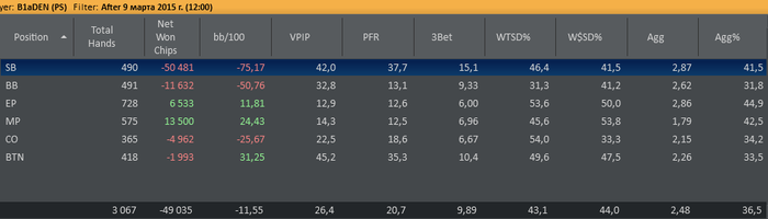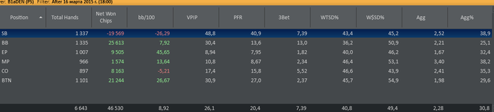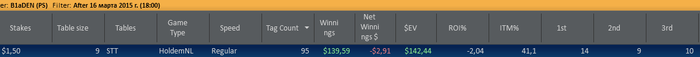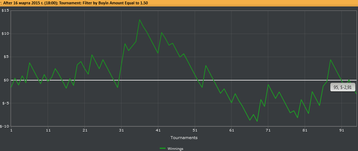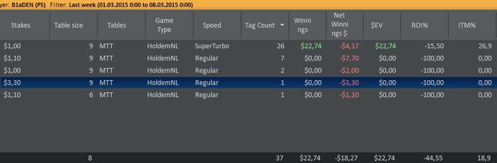Отчет за неделю 02-08.03.15 Неделя начиналась неплохо отыграл две сессии в +, но субботний марафон все перечеркнул. Из почти 30 турниров в субботу в ИТМ попал только в 3х и то не за финальный стол. Положительного на этой недели -стал чаще 3бетить, что действительно облегчает игру