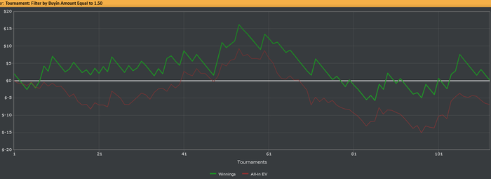 Два дня катаю в минус. Отыграл 4 сета т е 36 турниров, итог минус $12. Первый день мало проходов в итм, но все три прохода это первые места (-$6). Второй день 7 проходов в итм, но из них пять третьих мест (-$6). Сегдня- завтра собираюсь вернуть проигранное.