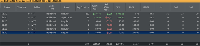 Подведем итоги марта Задачи которые ставил перед собой на этот месяц я выполнил -играть строго по банкроллу - в начале месяца я играл 180 макс по $1 и со временем полностью переключился на 9 макс за $1.5 -перейти на игру в 8 турниров одновременно - под конец месяца я полностью перешел на сессии по 8 подгруженных турниров -отыграть минимум 200 турниров, количество меньше чем в феврале, но обязательно следовать установленному распорядку (играть по 1 сету турниров в понедельник, среду, пятницу и полноценную сессию в субботу) - я перевыполнил этот пункт в первую очередь из-за перехода на 9макс турниры которые и набираются живее и проходят значительно меньше по времени